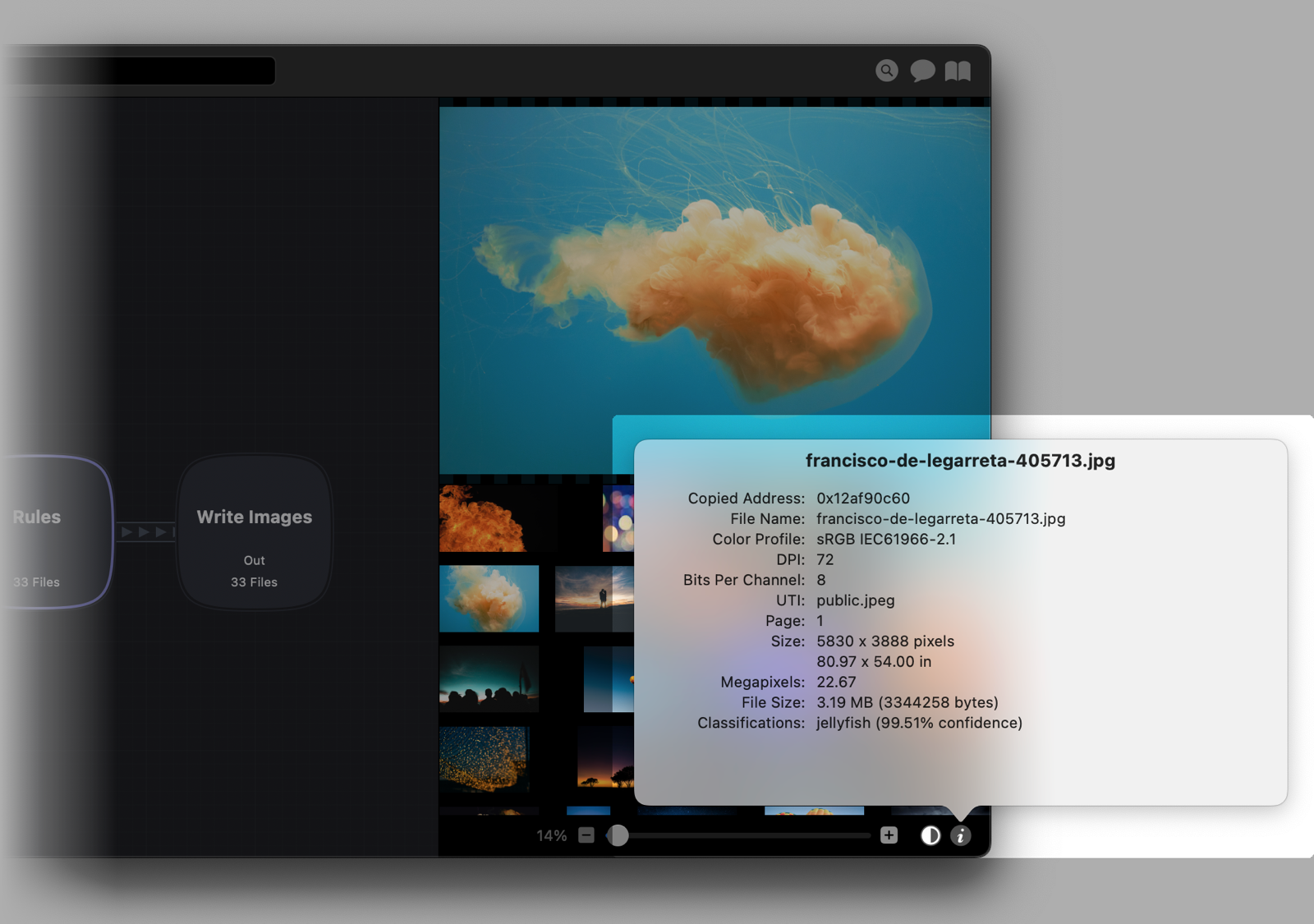 The Rules node is set up to pull out any images whose classification includes 'hotdog'. Image classification information can be found by clicking on an image in the scrubber, then clicking the 'i' in the lower righthand corner of the window.