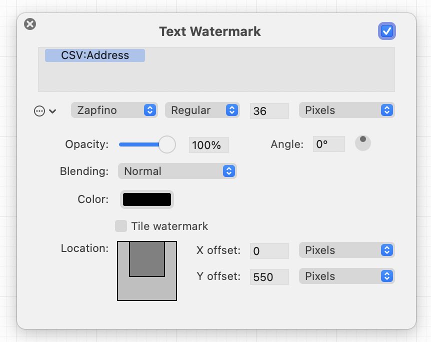Next, add the address in a smaller font. Insert another Text Watermark node and set the font size to 36px. For the token field, choose "CSV:Address." The node properties should look similar to this: