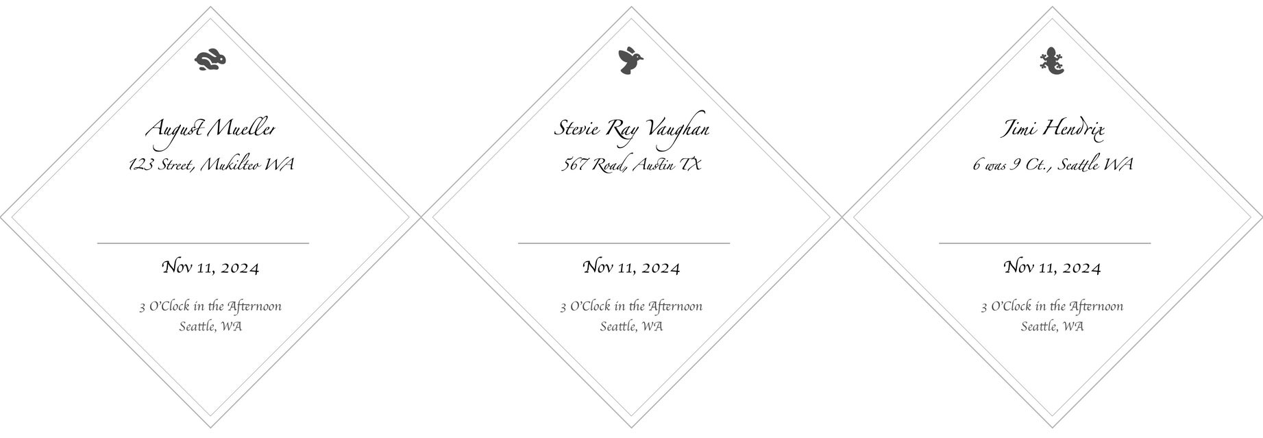 FullName: The guest's full name.Address: Their address.WhimsyImage: A unique image for each individual.OutputFileName: The name for the output image file.