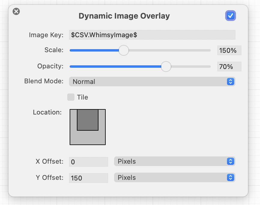 In the Dynamic Image Overlay node, type $CSV.WhimsyImage$ to specify the source for the images.