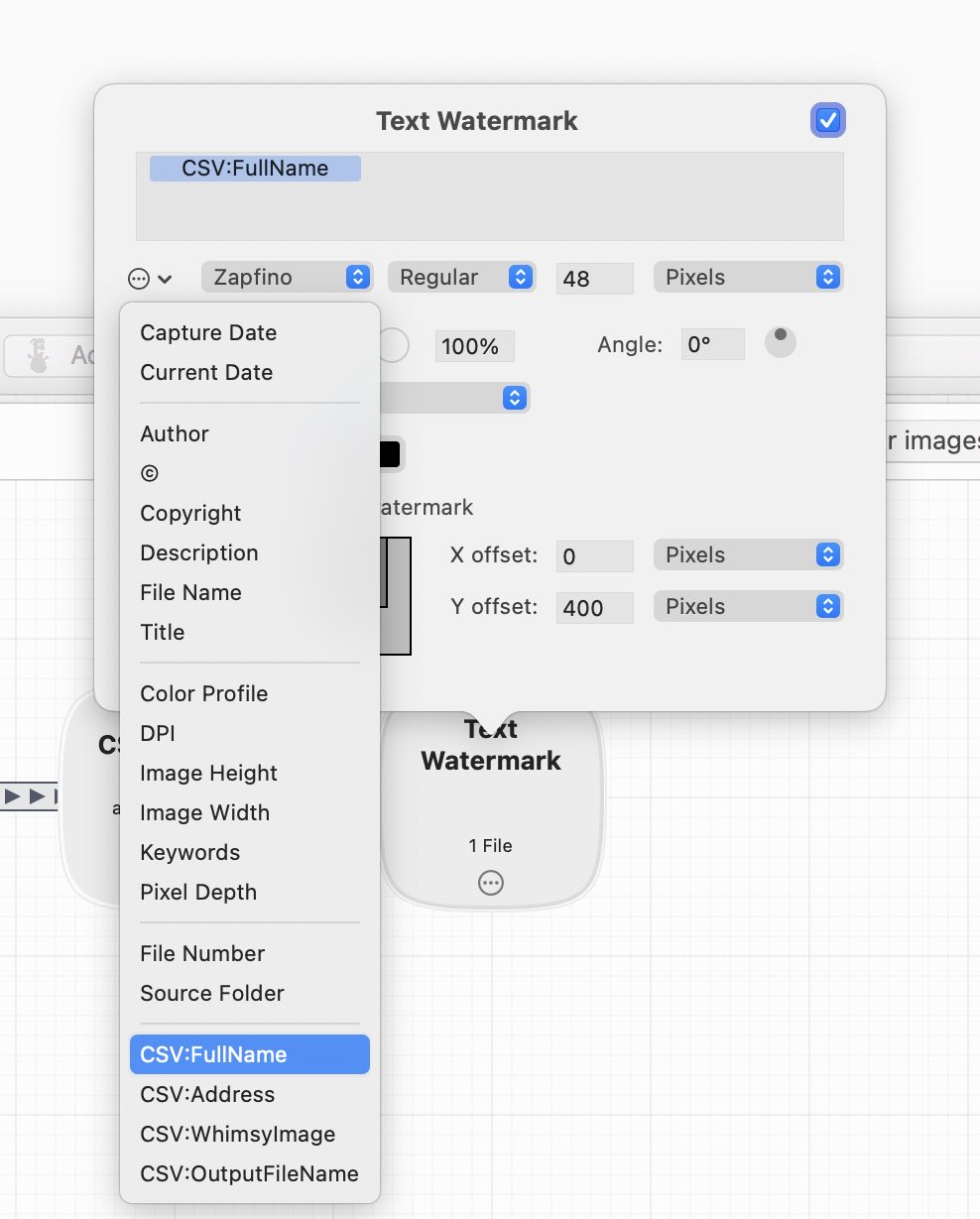 Now, return to the workflow. Open the properties for the Text Watermark node and select the dropdown menu. You will see entries from the CSV file. Select "CSV:FullName," and a new text token will be added to the text box. Adjust the font and size as needed (e.g., Zapfino at 48px), center the image, and set a Y offset of 400 pixels for the text placement.