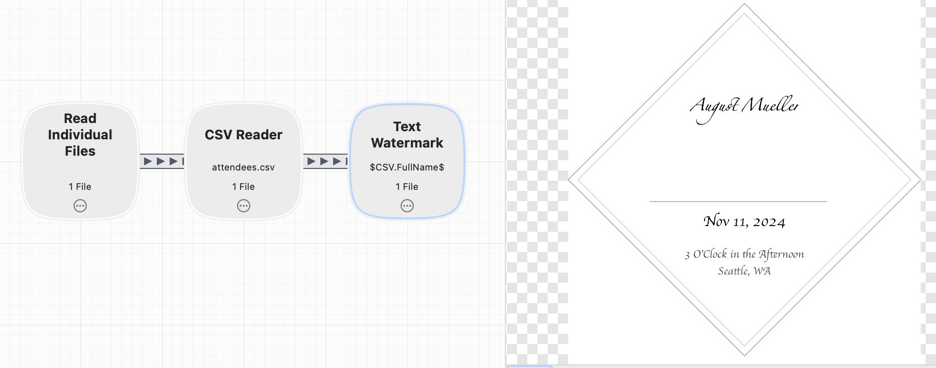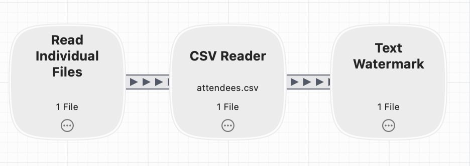 Next, drag and drop your CSV file onto the canvas. This will automatically create a "CSV Reader" node. Then, add a "Text Watermark" node after it. Your canvas should now resemble the following:
