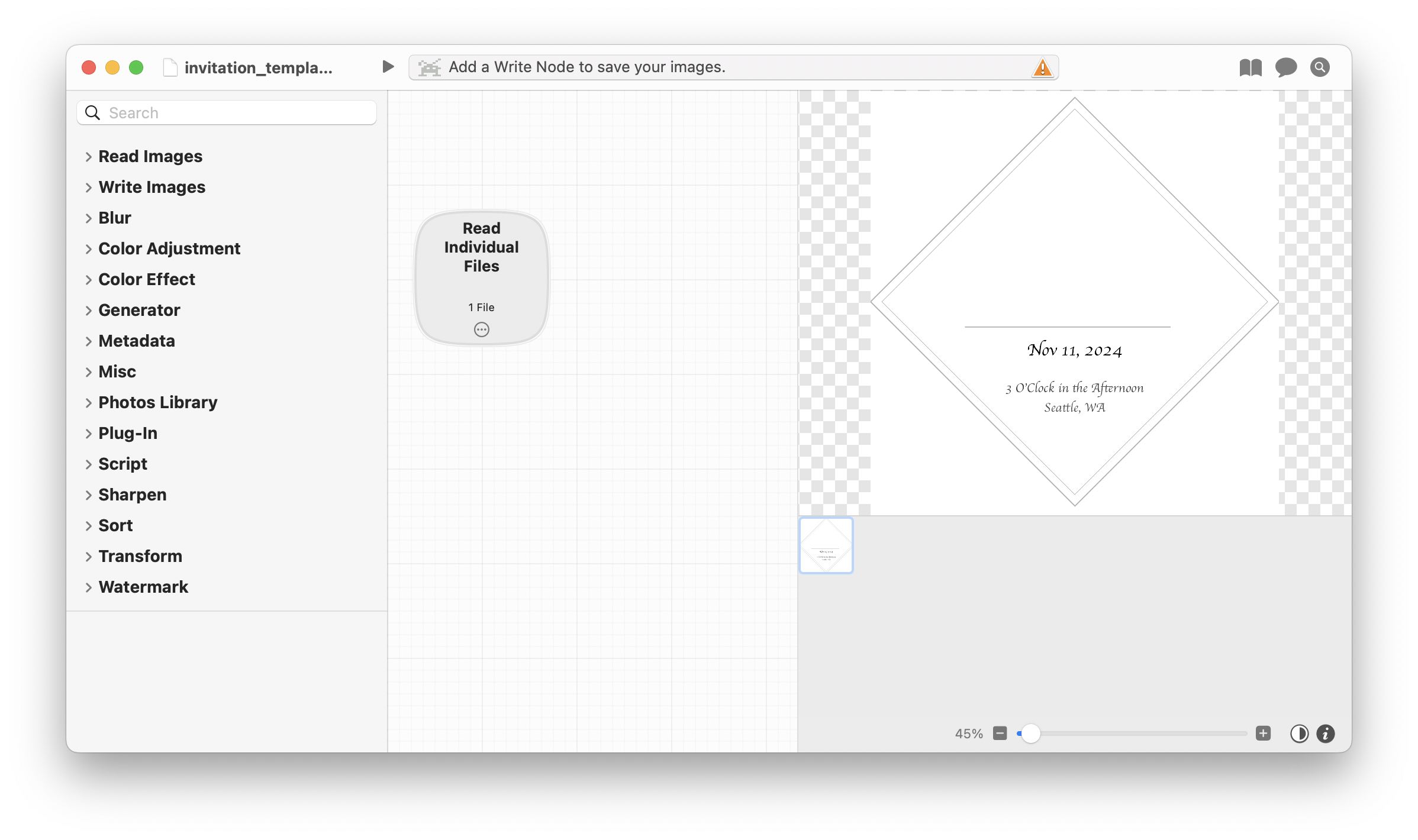To begin, create a new workflow and save it as invitation_template.retrobatch. Next, drag and drop the template/background image (invitation_template.png) onto the canvas: