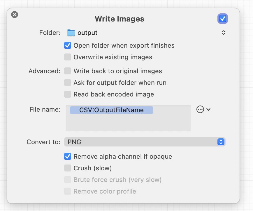 Lastly, you need to save the output images. Add a "Write Images" node, specify the output folder, and set the file name to "CSV:OutputFileName". This ensures the images are named according to the OutputFileName field from the CSV file. Set the file type to PNG.