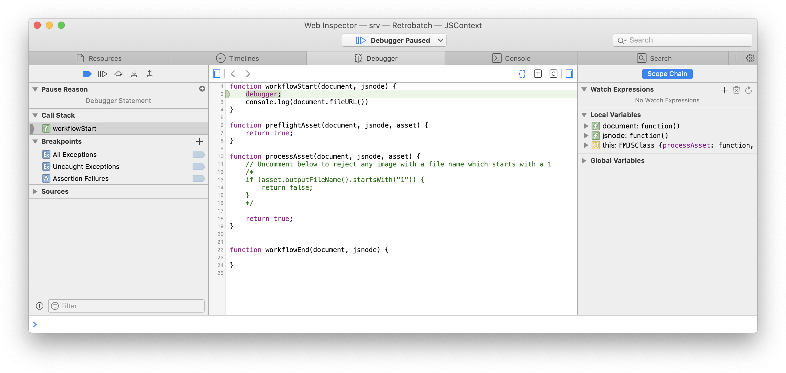 Next, choose the Develop ▸ (your computer name) ▸ Automatically Show Web Inspector for JSContexts menu item. This tells Safari to listen to any applications that create a JSContext debugger anytime Retrobatch runs a script.