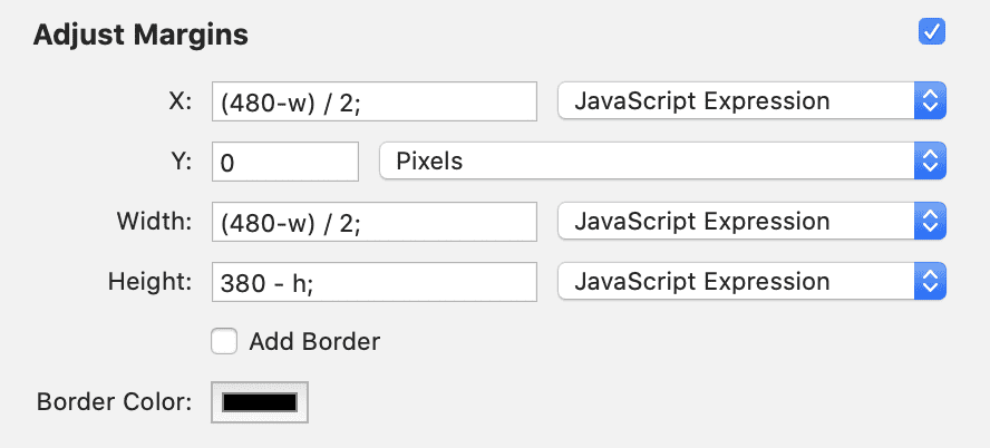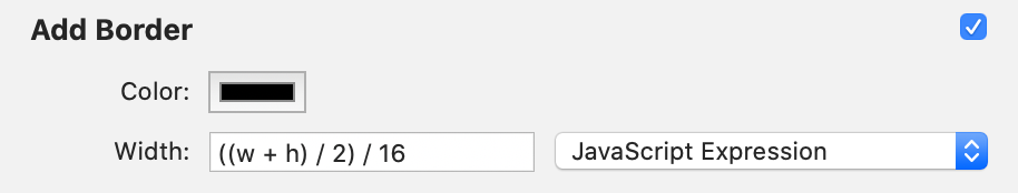 Retrobatch Pro now has the option to use a little snippet of JavaScript code to calculate values for nodes which allow you to set the size or length of a value (such as the width or height in the Crop node, or the x/y positions in the Gradient node). Let's say you wanted a border added to your image that was 1/16th of the average between the width and height of your image. You would then use the following snippet: ((w + h) / 2) / 16