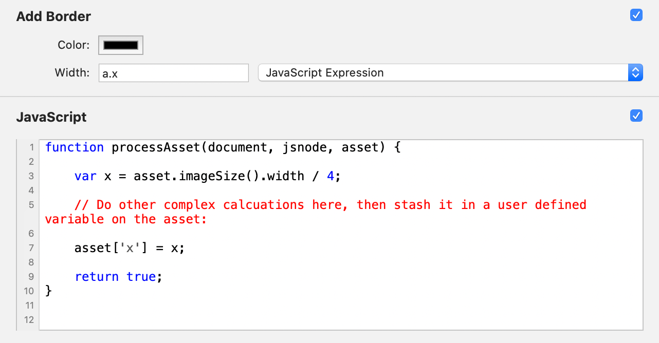You'll notice that the expression field you type in doesn't have much room. If you have a more complex operation, you can add a JavaScript node before the node with your expression, and calculate your values in there. Then, once you have your value (in this case, 'x'), you can store it in a user defined variable on the asset, and in the JS Expression field, just return that pre-calculated value.