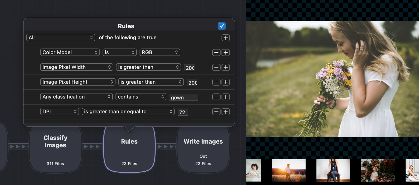 The Rules node is available in the Pro version of Retrobatch. Rules filter out images based on set criteria. Rules are a powerful way of sorting images quickly based on the listed options below.