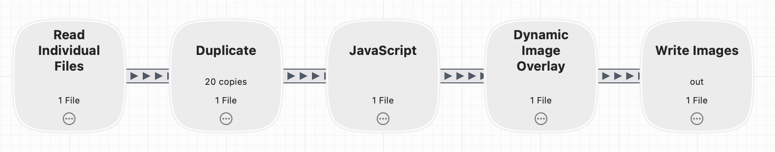 To illustrate, consider a workflow that generates 20 images from a base template, with each image having a randomly assigned overlay. You may download the sample project above.